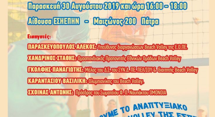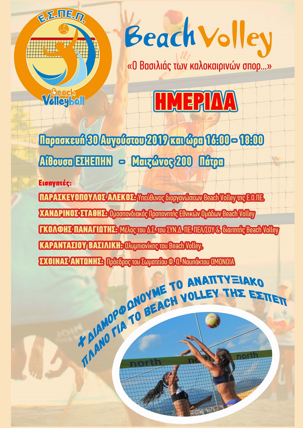 Το Δ.Σ. της ΕΣΠΕΠ. με αφορμή της διοργάνωσης των ΙΙ Μεσογειακών Παράκτιων αγώνων που θα διεξάγονται στην Πάτρα, διοργανώνει την Παρασκευή 30/8/2019 και ώρα 16:00 με 18:00, ενημερωτική συνάντηση με εκπροσώπους σωματείων, προπονητές, διαιτητές καθώς και ιδιοκτήτες εγκαταστάσεων Beach Volley των περιοχών ευθύνης της, θέλοντας να συνδιαμορφώσουν το αναπτυξιακό πλάνο για το Beach Volley στην Πελοπόννησο.