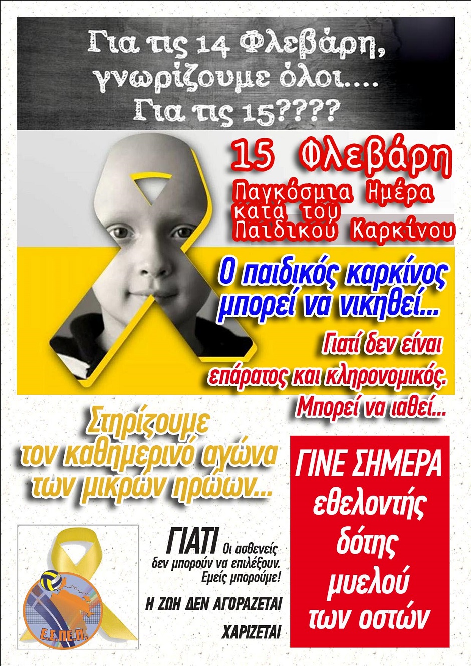 Η Ε.Σ.ΠΕ.Π. στο πλαίσιο ενημέρωσης και ευαισθητοποιήσεις της κοινωνίας, αφιερώνει το Σαββατοκύριακο 15 & 16 Φεβρουαρίου 2020 τις Αγωνιστικές υποχρεώσεις των πρωταθλημάτων της, στον αγώνα στήριξης των παιδιών που νοσούν και δίνουν την καθημερινή τους μάχη με τον καρκίνο.