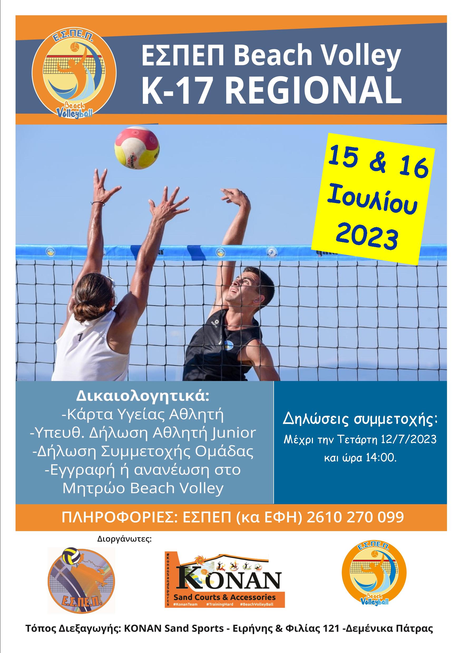Σύμφωνα με την Γενική Προκήρυξη του Beach–volley Κ-17 Παίδων – Κορασίδων της Ε.Ο.ΠΕ. και την Ειδική Προκήρυξη της ΕΣΠΕΠ , θα πρέπει να ολοκληρώσουμε την ανάδειξη του πρωταθλητή της Ένωσης μας μέχρι στις 17 Ιουλίου 2023.