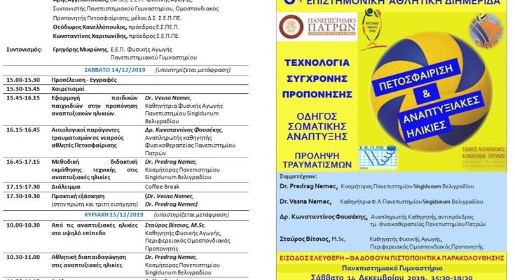 Το Πανεπιστήμιο Πατρών, η Ένωση Σωματείων Πετοσφαίρισης Πελοποννήσου (Ε.Σ.ΠΕ.Π.), και ο Σύνδεσμος Ελλήνων Προπονητών Πετοσφαίρισης (Σ.Ε.Π.ΠΕ.), συνδιοργανώνουν την 6η Επιστημονική Αθλητική Διημερίδα για την Πετοσφαίριση, το Σάββατο 14 & Κυριακή 15 Δεκεμβρίου 2019, με Θέμα «Πετοσφαίριση και Αναπτυξιακές Ηλικίες-Τεχνολογία σύγχρονης Προπόνησης, Οδηγός σωματικής Ανάπτυξης και πρόληψης τραυματισμών.