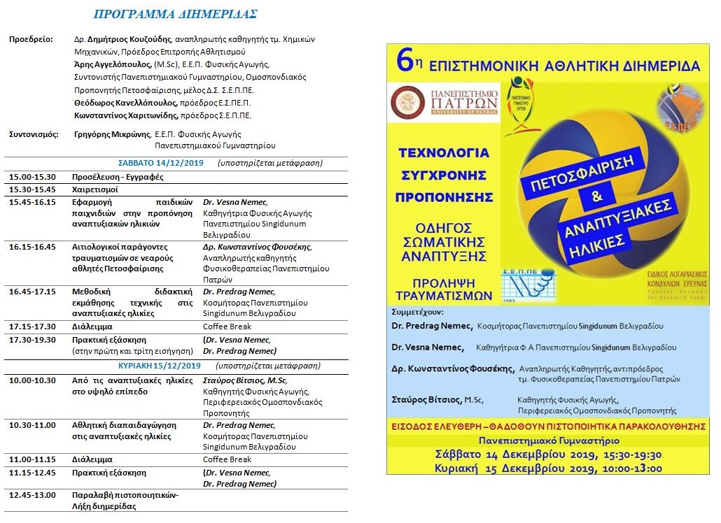 Το Πανεπιστήμιο Πατρών, η Ένωση Σωματείων Πετοσφαίρισης Πελοποννήσου (Ε.Σ.ΠΕ.Π.), και ο Σύνδεσμος Ελλήνων Προπονητών Πετοσφαίρισης (Σ.Ε.Π.ΠΕ.), συνδιοργανώνουν την 6η Επιστημονική Αθλητική Διημερίδα για την Πετοσφαίριση, το Σάββατο 14 & Κυριακή 15 Δεκεμβρίου 2019, με Θέμα «Πετοσφαίριση και Αναπτυξιακές Ηλικίες-Τεχνολογία σύγχρονης Προπόνησης, Οδηγός σωματικής Ανάπτυξης και πρόληψης τραυματισμών.